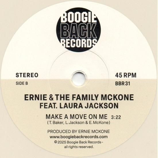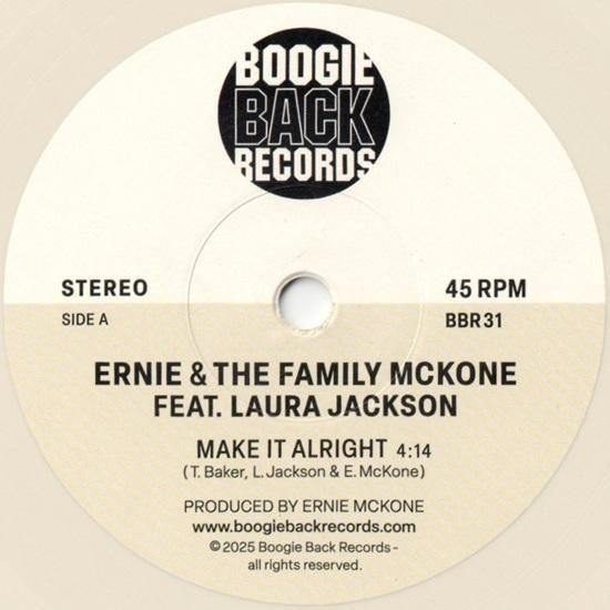 レアグルーヴ/ジャズファンク/ソウルを専門とする英国アンダーグラウンド・レーベルBoogie Back Recordsからニューシングル「Ernie & The Family Mckone feat. Laura Jackson - Make It Allright / Make A Move On Me」が遂にフィジカル・ドロップ!レーベルCEOでもあるベーシストErnie Mckone率いるグループErnie & The Family McKoneに、The Doggett BrothersのボーカリストLaura Jacksonをフィーチャーした90年代歌モノ風味が注入されたアップテンポ・ステッパー!